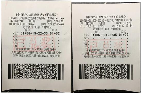 11月9日,中國體育彩票超級大樂透第16132期開獎,當期開獎號碼為04 18 19 22 35+01 02,四川彩民和浙江彩民分別將追加投注一等獎1600萬元和基本投注一等獎1000萬元收入囊中。