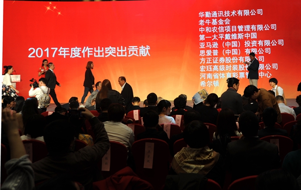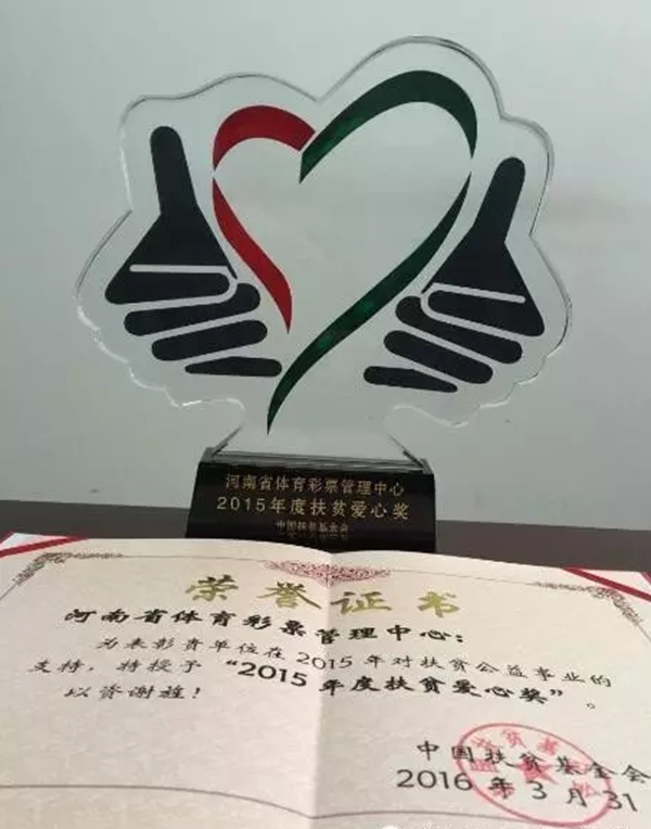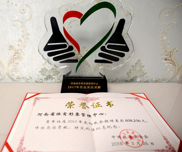 河南省體育彩票管理中心榮獲中國扶貧基金會“2017年度扶貧突出貢獻獎”,中心黨支部書記王海新代表單位領(lǐng)取了獎杯和證書。