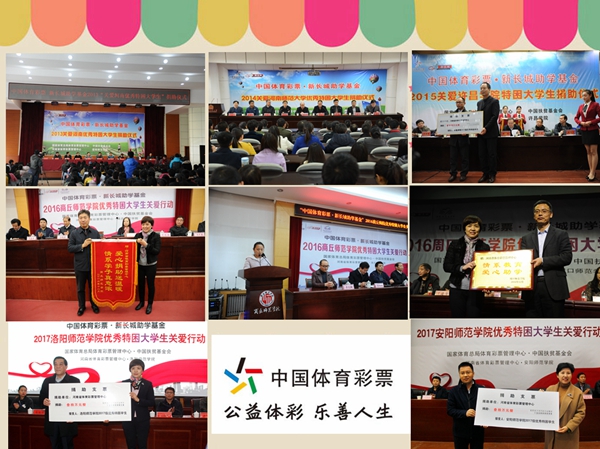 河南省體育彩票管理中心自2013年開始,已經(jīng)連續(xù)五年通過國家體育總局體育彩票管理中心與中國扶貧基金會合作,以“中國體育彩票·新長城助學(xué)基金”形式,向信陽師范學(xué)院、河南師范大學(xué)、許昌學(xué)院、商丘師范學(xué)院、周口師范學(xué)院、洛陽師范學(xué)院、安陽師范學(xué)院共計7所院校的400名優(yōu)秀貧困大學(xué)生累計捐助助學(xué)金200萬元。2015年,河南體彩中心在前兩年每年捐助50名貧困大學(xué)生的基礎(chǔ)上,將受助名額增加到了60名,2016年開始又將捐贈學(xué)校從一所增加到兩所,受助學(xué)生名額從60名又增加到120名,每個學(xué)生的受助金額從4000元提高到了5000元,希望幫助更多的困難學(xué)生及其家庭減輕經(jīng)濟負擔(dān)和精神壓力。