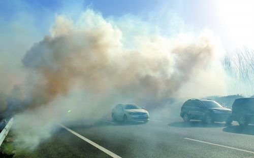 濃煙在高速路上彌漫,過往車輛只得降低速度,謹(jǐn)慎穿越濃煙。