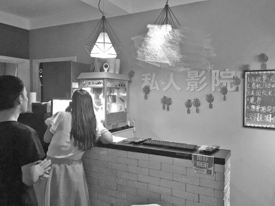 “影院的小包間適合2~4人,大的最多可坐8人?!蓖砩?0點,所設(shè)5個包間已全部滿員,包間都為不帶窗木門,均可反鎖?!昂蛴皬d”內(nèi)設(shè)置有新片推介板、爆米花機和各式酒水,不少年輕男女正排隊等待觀影。