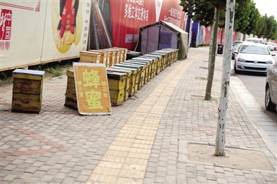 昨日上午,市民致電本報(bào)稱,啟福大道與南水北調(diào)渠北200米處,啟福中華小區(qū)北門口的人行道上,有人擺放了30多箱蜜蜂,不僅占道,不時(shí)飛出的蜜蜂還侵?jǐn)_行人。