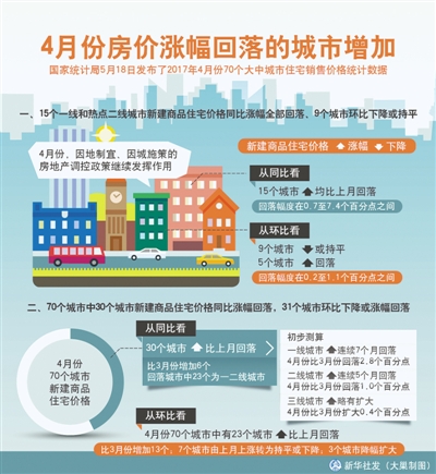 國家統(tǒng)計(jì)局城市司高級(jí)統(tǒng)計(jì)師劉建偉解讀稱,從環(huán)比看,4月份70個(gè)城市中有23個(gè)城市新建商品住宅價(jià)格漲幅比上月回落,比3月份增加13個(gè);7個(gè)城市由上月上漲轉(zhuǎn)為持平或下降;3個(gè)城市房?jī)r(jià)降幅擴(kuò)大。