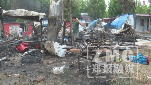 現(xiàn)場(chǎng)村民介紹,火災(zāi)發(fā)生時(shí)附近有人正在做滿月酒,屋頂電線突然“噼啪”作響,火星濺下引燃了安置區(qū)的簡(jiǎn)易房,失火房屋內(nèi)放置有生產(chǎn)包的設(shè)備和成捆的布匹。