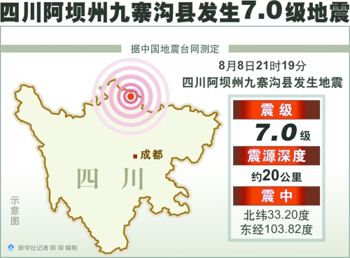 8月8日21時19分49秒,阿壩州九寨溝縣(東經103.82度、北緯33.20度)發(fā)生7.0級地震,震源深度約20公里。