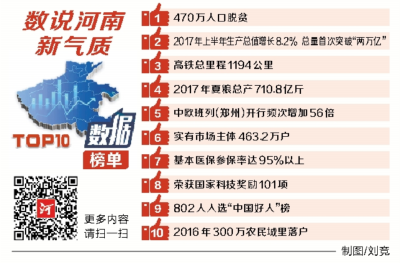 根據(jù)網(wǎng)友投票結果和專家評審意見,這份令人矚目的榜單最終揭開神秘“面紗”。其中,470萬人口脫貧、2017年上半年生產(chǎn)總值增長8.2%總量首次突破“兩萬億”和高鐵總里程1194公里名列前三位,2017年夏糧總產(chǎn)710.8億斤、中歐班列(鄭州)開行頻次增加56倍、實有市場主體463.2萬戶、基本醫(yī)保參保率達95%以上、榮獲國家科技獎勵101項、802人入選“中國好人”榜、2016年300萬農民城里落戶等7個數(shù)據(jù)也榜上有名。