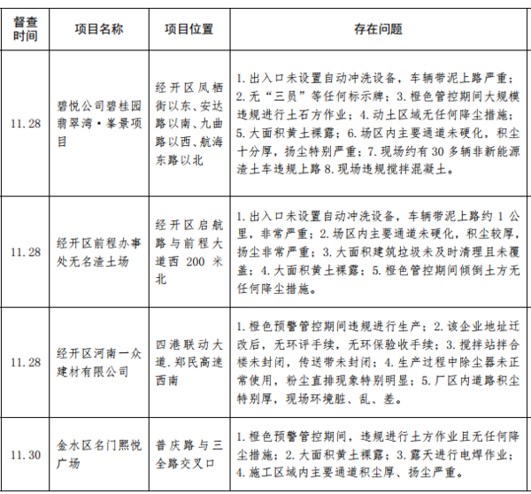 12月7日,記者從鄭州市環(huán)境污染防治攻堅辦了解到,11月27日至12月3日,鄭州市環(huán)境污染防治督導組重點對全市"封土行動"方案、橙色預警管控措施落實和30天沖刺行動方案落實情況進行督導檢查。從督查情況來看,大部分單位都夠按照要求,落實"封土令"和預警管控措施,但也有個別施工工地和企業(yè)未按要求停工、停產(chǎn)或限產(chǎn)減排。