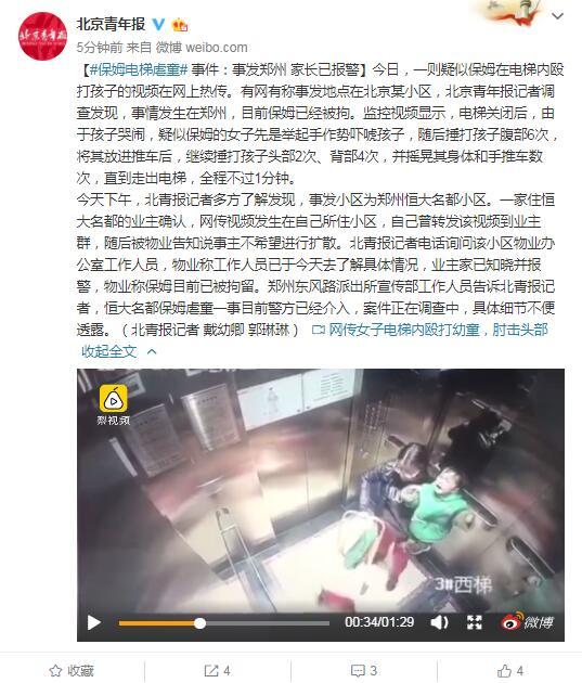 今日,一則疑似保姆在電梯內(nèi)毆打孩子的視頻在網(wǎng)上熱傳。有網(wǎng)有稱事發(fā)地點(diǎn)在北京某小區(qū),北京青年報(bào)記者調(diào)查發(fā)現(xiàn),事情發(fā)生在鄭州,目前保姆已經(jīng)被拘。監(jiān)控視頻顯示,電梯關(guān)閉后,由于孩子哭鬧,疑似保姆的女子先是舉起手作勢(shì)嚇唬孩子,隨后捶打孩子腹部6次,將其放進(jìn)推車后,繼續(xù)捶打孩子頭部2次、背部4次,并搖晃其身體和手推車數(shù)次,直到走出電梯,全程不過1分鐘。