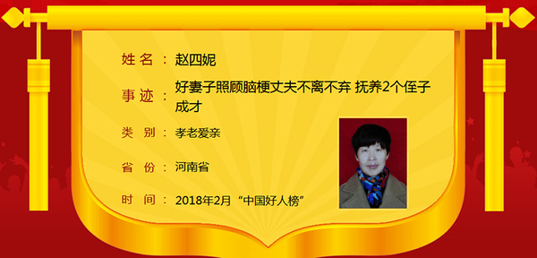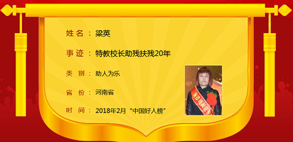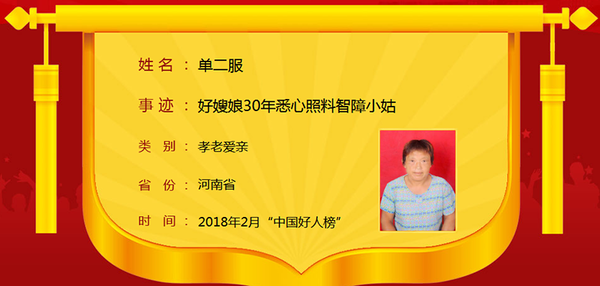 大河網(wǎng)訊 3月4日,2018年2月“中國好人榜”發(fā)布,共有101位助人為樂、見義勇為、誠實(shí)守信、敬業(yè)奉獻(xiàn)、孝老愛親的身邊好人榮登該榜,河南省共有6位好人光榮上榜。他們分別是助人為樂好人:助殘扶殘20年的特教校長梁英。見義勇為好人:冬夜聯(lián)手相救落水老人的基層干部韓俊杰、李紅衛(wèi)。敬業(yè)奉獻(xiàn)好人:細(xì)心照料老人10余年的愛心男護(hù)理蔣禹成。孝老愛親好人:照顧腦梗丈夫不離不棄,撫養(yǎng)2個侄子成才的好妻子趙四妮;30年悉心照料智障小姑的好嫂娘單二服。