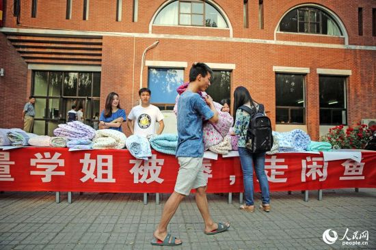 2015年05月31日,北京,清華大學(xué),今年即將畢業(yè)回國的韓國女生李惠林正在參與買被子。高價被子的主人是清華大學(xué)工藝美術(shù)系的一名留學(xué)生李惠林,現(xiàn)年大四的她畢業(yè)后將要回韓國,于是將大部分不便攜帶的生活物品都賣給了龍一, 除了被子,還有書和化妝品。