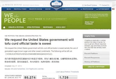 “我們請(qǐng)求美國政府取締北京煎餅果子!”9日,美國白宮供民眾向政府表達(dá)意愿的請(qǐng)?jiān)妇W(wǎng)站“我們?nèi)嗣瘛背霈F(xiàn)了這樣一則中文“請(qǐng)?jiān)浮眱?nèi)容。最近幾天來,該網(wǎng)站多次出現(xiàn)疑來自華人的請(qǐng)?jiān)?,不少?nèi)容很無厘頭。