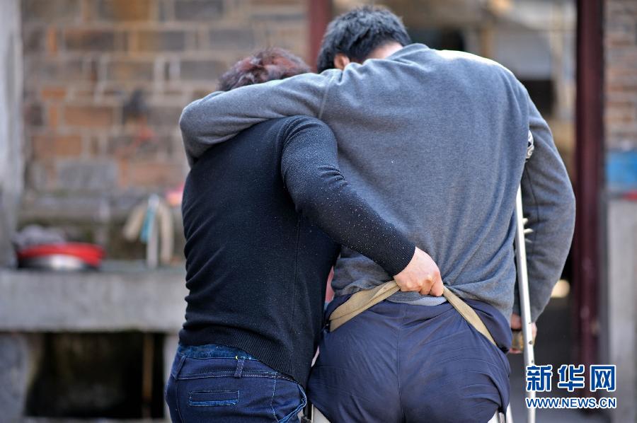 一個妻子不離不棄的感人故事,在安徽省舒城縣曉天鎮(zhèn)幾乎家喻戶曉。 2006年初夏,曉天鎮(zhèn)街道的汪世俊在安裝廣告牌時,不幸從腳手架上摔了下來,造成下肢癱瘓。妻子張先琴始終不離不棄,8年如一日,未曾走過親戚,出過遠門。丈夫癱瘓后的頭3年里,每隔半個鐘頭就要翻一次身,還需要及時更換尿布,張先琴沒有睡過一個安穩(wěn)覺。為了防止肌肉萎縮,張先琴想辦法將繩子系在丈夫腰間,協(xié)助他進行康復訓練。從一個健全人變成殘疾人,巨大的心理落差使汪世俊脾氣變得暴躁,他常常發(fā)無名火,可每每這時,張先琴總能默默忍受。張先琴說:丈夫能有說有笑,沒有失去生活的信心,這比什么都重要。 新華社發(fā)(呂務農(nóng) 攝)