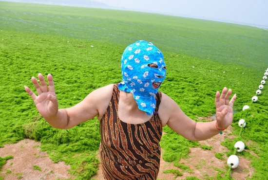 2013年7月3日,山東青島青島高溫來(lái)襲,“青島大媽”不懼滸苔,戴著“強(qiáng)盜面具”出現(xiàn)在海水浴場(chǎng)消暑降
