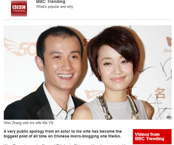 終于,出現(xiàn)在外國(guó)媒體報(bào)道中的華人明星名字不再只是鞏俐、章子怡等國(guó)際腕兒了。霸占國(guó)內(nèi)娛樂(lè)圈頭條的“文章出軌事件”,已經(jīng)漂洋過(guò)海到了全球各地,出現(xiàn)在多家國(guó)外媒體的版面上。包括英國(guó)BBC、《每日郵報(bào)》、美國(guó)《美聯(lián)社》、《紐約每日新聞報(bào)》、《好萊塢記者報(bào)道》、《娛樂(lè)在線(xiàn)》、澳洲《悉尼先驅(qū)晨報(bào)》、加拿大CBC、越南《民智報(bào)》新聞網(wǎng)站(dantri.com.vn)等多家外媒都對(duì)此事進(jìn)行了報(bào)道,并集體關(guān)注文章道歉微博所打破的社交媒體轉(zhuǎn)發(fā)記錄。