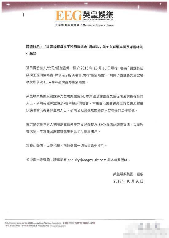 謝霆鋒經(jīng)紀(jì)人霍汶希表示“本集團(tuán)及謝霆鋒先生從來沒有授權(quán)任何人士、公司或組織宣傳或舉辦該演唱會(huì)。本集團(tuán)及謝霆鋒先生于發(fā)布及宣傳該演唱會(huì)及有關(guān)訊息的人士、公司及組織毫無關(guān)系,不存在任何合作關(guān)系?!币悦夥劢z受騙,同時(shí)保留一切法律追究權(quán)利。