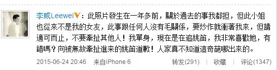 6月24日晚,李威發(fā)布微博回應(yīng)“照片門”,表示“此照片發(fā)生在一年多前,關(guān)于過去的事我都擔(dān),但此小姐也從來不是我的女友,此事跟任何人沒有毛關(guān)系,要炒作就沖著我來,但請適可而止,不要牽扯其他人!我單身,現(xiàn)在是在追姚笛,我非常喜歡她,有錯嗎?向被無故牽扯進來的姚笛道歉!人家真不知道這奇葩哪出來的?!?/font>