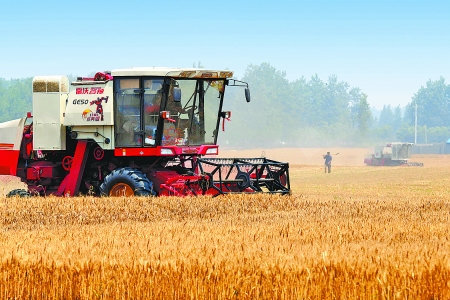 6月9日,收割機在武陟縣龍泉辦事處郭堤村作業(yè)。目前,武陟縣已收獲小麥43萬畝,收獲面積過半。馮小敏 攝