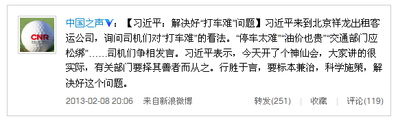 【習(xí)近平:解決好“打車難”問題】習(xí)近平來到北京祥龍出租客運(yùn)公司,詢問司機(jī)們對“打車難”的看法?!巴\囂y”“油價(jià)也貴”“交通部門應(yīng)松綁”……司機(jī)們爭相發(fā)言。習(xí)近平表示,今天開了個(gè)神仙會(huì),大家講的很實(shí)際,有關(guān)部門要擇其善者而從之。行勝于言,要標(biāo)本兼治,科學(xué)施策,解決好這個(gè)問題。