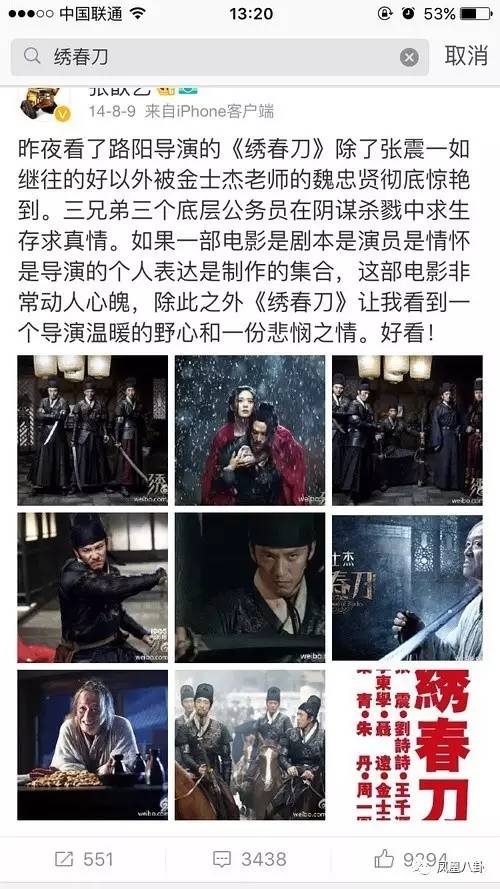 2014年,張歆藝發(fā)一條微博夸贊電影《繡春刀》的導(dǎo)演和男演員。