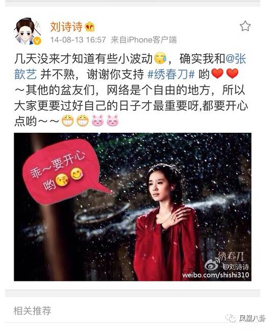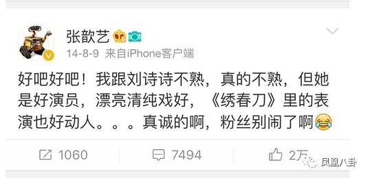 眼看事情越鬧越大,劉詩詩自己發(fā)微博表態(tài)“謝謝張歆藝的夸獎”,這件事才最終翻篇。