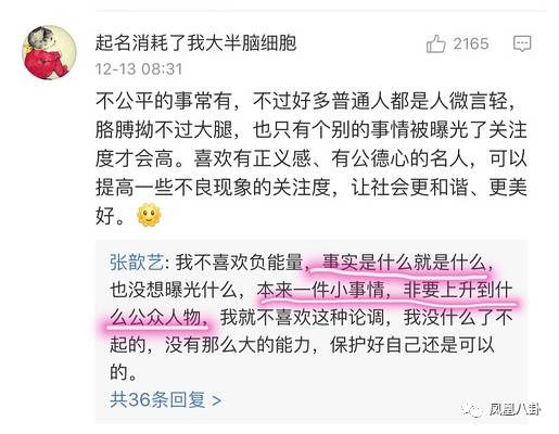 至于張歆藝在評論中說的別把我當(dāng)公眾人物,小妹(鳳凰八卦微信號:entifengvip)也不能茍同,從事演員這份職業(yè),微博粉絲過千萬,在享受公眾人物的便利時(小妹(鳳凰八卦微信號:entifengvip)就做不到拿別人的名字掛號),是不是也應(yīng)該承擔(dān)起公眾人物的社會責(zé)任呢?