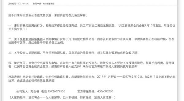 當(dāng)日,來財(cái)街官網(wǎng)首先發(fā)布了春節(jié)放假通告,稱因央企新興際華集團(tuán)旗下公司擬入股來財(cái)街母公司金弋資本,須對來財(cái)街公司運(yùn)營狀況進(jìn)行全面審計(jì),同時(shí),根據(jù)國務(wù)院假日安排和公司實(shí)際情況,現(xiàn)來財(cái)街公布春節(jié)假期時(shí)間:2017年1月19日-2017年2月10日。這個(gè)假期已經(jīng)達(dá)到了23天,遠(yuǎn)遠(yuǎn)多于國家法定假日要求的時(shí)間。
