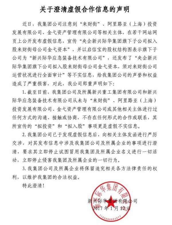 對于這一“抱大腿”的行為,新興際華1月22日在其官網(wǎng)發(fā)布《關(guān)于澄清虛假合作信息的聲明》,稱“央企新興際華集團(tuán)旗下公司擬入股金戈資本,須對來財(cái)街公司運(yùn)營狀況進(jìn)行全面審計(jì)”為不實(shí)信息,并聲明新興際華及其所屬新興重工集團(tuán)有限公司、新興際華應(yīng)急裝備技術(shù)有限公司從未與來財(cái)街、阿里路亞(上海)投資發(fā)展有限公司、金戈資產(chǎn)管理有限公司進(jìn)行過任何方式的溝通、接觸或協(xié)商,不存在任何形式的合作或聯(lián)系。
