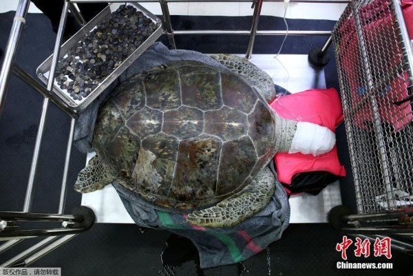 當?shù)貢r間2017年3月6日,泰國曼谷,泰國朱拉隆功大學為海龜Omsin手術取出硬幣。據(jù)悉,一只痛苦的海龜誤吞了廢棄池塘中許愿硬幣,結(jié)果導致嚴重健康問題。
