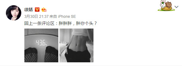 只見徐嬌親自站上體重機,測量并公開真實體重是43.6公斤,配合164公分的身高,身材其實相當纖瘦,不僅如此,接著更大膽掀起白色上衣,露出隱藏的腹肌和小蠻腰,并寫下:“回上一條評論區(qū):胖胖胖,胖你個頭?”真性情引起粉絲狂贊。