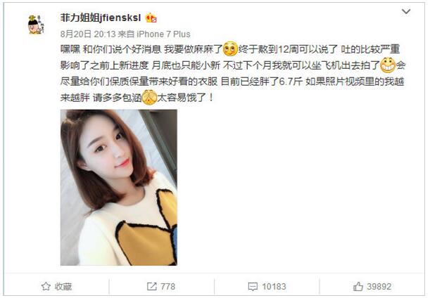 8月20,雪莉在小號微博@“菲力姐姐jfiensksl ”公布懷孕:“嘿嘿,和你們說個好消息,我要做媽媽了,終于熬到12周可以說了,吐的比較嚴重,影響了之前上新進度,月底也只能小新,不過下個月我就可以坐飛機出去拍了。會盡量給你們保質(zhì)保量帶來好看的衣服,目前已經(jīng)胖了6.7斤,如果照片視頻里的我越來越胖,請多多包涵,太容易餓了! ”