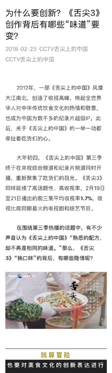 《舌尖上的中國》官方轉(zhuǎn)發(fā)某媒體長文回應(yīng)第三季質(zhì)量不佳的質(zhì)疑:就算冒險,也要對美食文化的創(chuàng)新表達進行探索。