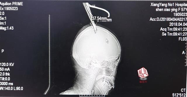 醫(yī)生檢查發(fā)現(xiàn),剪刀刀尖斜嵌在沈某顱骨里,離腦髓只有兩三毫米。所幸是斜著插進(jìn)去,如果是垂直刺入,很有可能造成癱瘓。