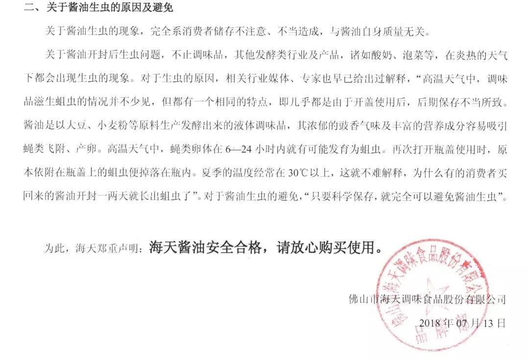 7月13日,海天味業(yè)在其官網(wǎng)發(fā)布“海天醬油安全合格,請放心購買使用”聲明。聲明稱,海天味業(yè)出場的產(chǎn)品均按照國家標(biāo)準(zhǔn)生產(chǎn),在出廠前均經(jīng)過檢驗(yàn)合格。因此,未開封的產(chǎn)品不會有活蟲和蟲卵生長。至于醬油開封后出現(xiàn)蛆蟲,海天味業(yè)解釋說,不止調(diào)味品,酸奶、泡菜等發(fā)酵產(chǎn)品在炎熱的條件下也容易生蟲。而醬油生蛆“完全是消費(fèi)者儲存不當(dāng)造成,與醬油自身質(zhì)量無關(guān)”。