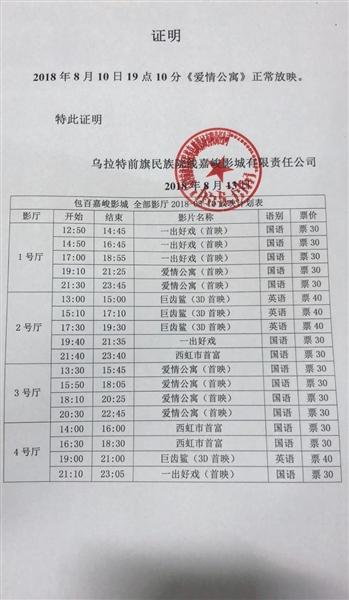 包百嘉峻影城給出影院排片來回應(yīng)證明。