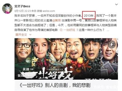 上映4天,黃渤導(dǎo)演的處女作《一出好戲》票房破6億。然而,8月12日晚,一位名叫于夢媛的編劇在微博發(fā)文稱,黃渤的《一出好戲》涉嫌抄襲她2013年寫的劇本《男人危機(jī)》。她在文中說道:“2013年,我寫了一個劇本并以一家影視公司的名義邀請黃渤出演劇中男一號,黃渤以故事框架與人物類型都不太適合為由拒絕了;但是,今天他卻用雷同的故事框架與人物類型自編自導(dǎo)自演了他作為導(dǎo)演的首部電影《一出好戲》!”新京報第一時間聯(lián)系了黃渤導(dǎo)演以及編劇于夢媛,兩人均未做出回應(yīng);隨后又聯(lián)系了當(dāng)時參與《男人危機(jī)》籌備工作的工作人員張進(jìn)(化名),還原了當(dāng)時的一些事情經(jīng)過。