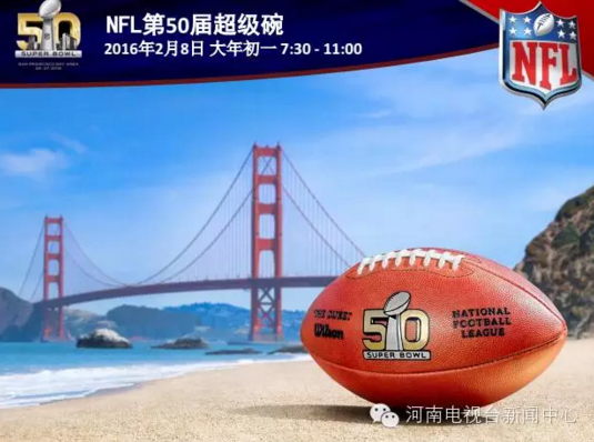 全美收視率最高的電視節(jié)目,全球最具商業(yè)價(jià)值的體育賽事,被稱為“美國(guó)春晚”的超級(jí)碗來了! 2月8日農(nóng)歷大年初一上午7:00到11:00,河南電視臺(tái)新聞?lì)l道全球同步直播第50屆美國(guó)職業(yè)橄欖球年度冠軍總決賽,敬請(qǐng)收看。