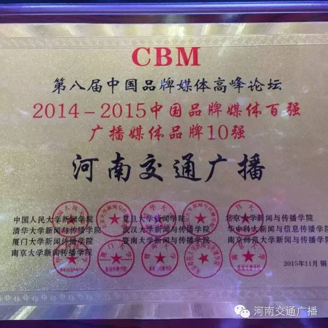 FM1041河南交通廣播榮獲2014-2015中國品牌媒體百強(qiáng)廣播媒體品牌10強(qiáng)。在河南廣播媒體中,僅此一個。這也是對河南交通廣播在節(jié)目、活動、服務(wù)方面成績的肯定。