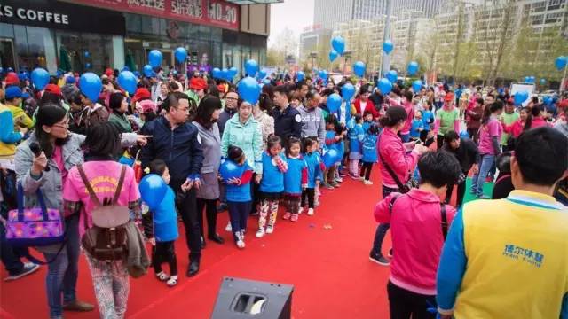 除了有藍色的氣球外,每個參與活動的人都穿著藍色的服裝,頭戴藍色帽子,手系藍色絲帶,整個活動現(xiàn)場成了一片藍色的海洋。