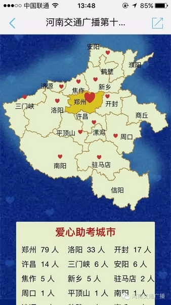 高考期間,河南交通廣播倡導全省車友綠色出行、在交廣領航上用愛心點亮河南地圖;