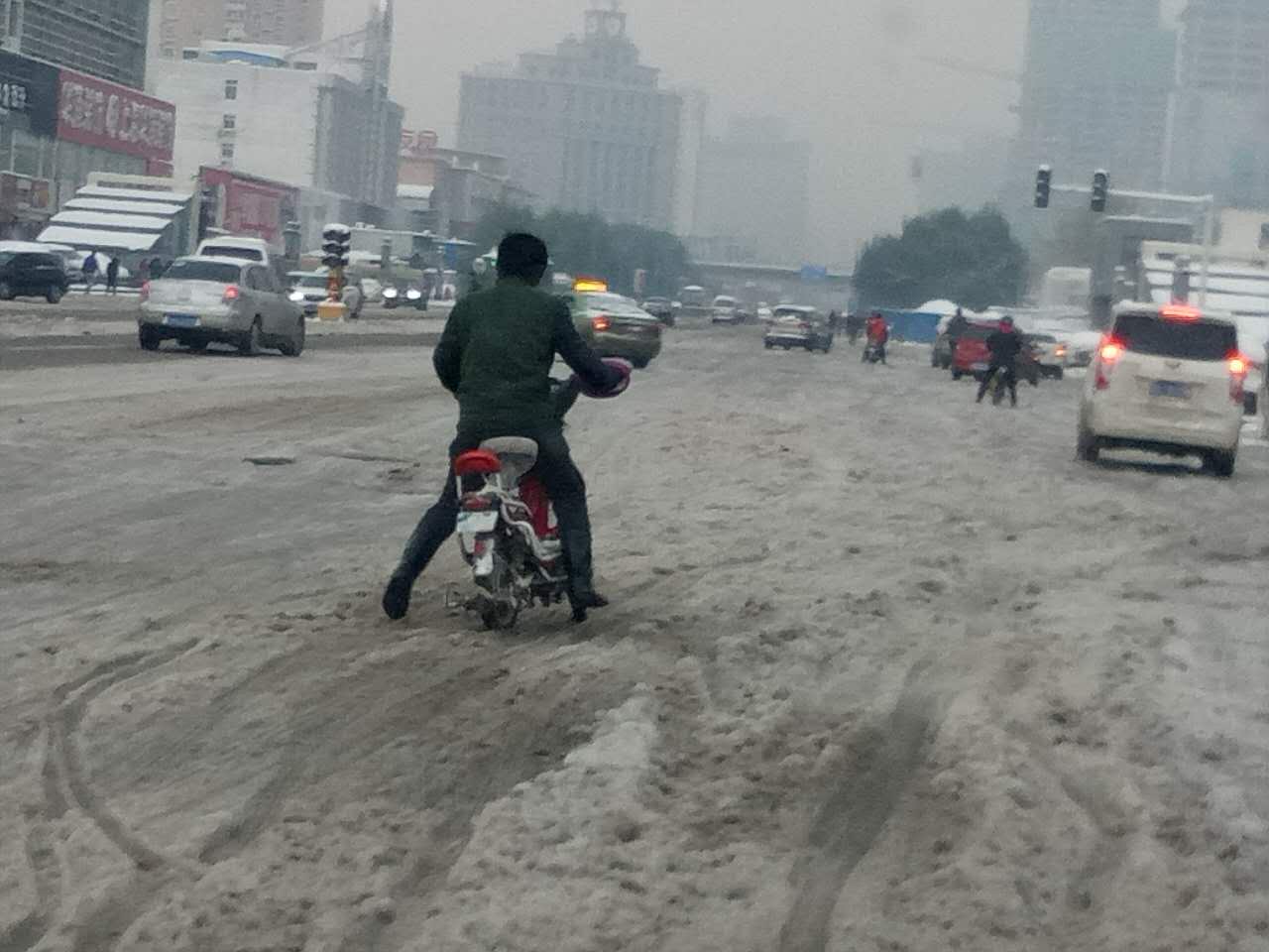 花園路上,市民在積雪中騎車(chē)艱難前行!騎電動(dòng)車(chē)的市民一定要注意,慢行慢行!剎車(chē)時(shí)候穩(wěn)一點(diǎn)慢一點(diǎn)?。ㄠ嵵萃韴?bào))