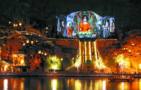 4月13日晚,河南洛陽龍門景區(qū)進(jìn)行了景區(qū)亮化工程提升后的首次試燈。2011年12月開始,龍門石窟景區(qū)進(jìn)行亮化提升,目前,景區(qū)內(nèi)的所有燈光已調(diào)試就緒,將于近期正式對游人開放。 新華社發(fā)