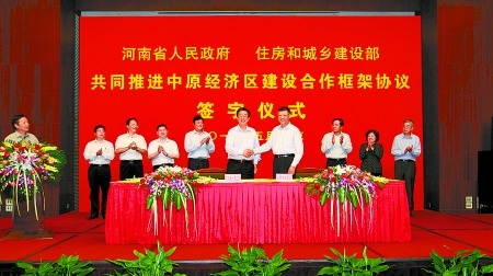 5月10日下午,河南省人民政府與住房和城鄉(xiāng)建設(shè)部在北京簽署《共同推進中原經(jīng)濟區(qū)建設(shè)合作框架協(xié)議》,省委副書記、省長郭庚茂,住房和城鄉(xiāng)建設(shè)部部長姜偉新出席簽字儀式,并代表雙方簽署協(xié)議。