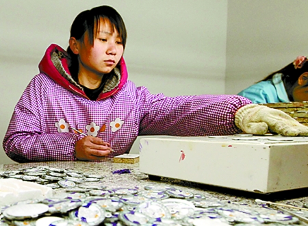 信陽市平橋區(qū)明港鎮(zhèn)大營(yíng)村利用城郊地理優(yōu)勢(shì),通過招商引資吸引外來投資3億多元。圖為3月27日,村民正在村里的合盛五金飾品加工廠制作徽章。 河南日?qǐng)?bào)記者 鄧 放 攝