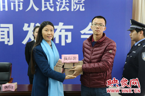 在發(fā)布會現(xiàn)場,全國人大代表、鄭州海龍集團董事長徐曉同志為兩起典型案件當(dāng)事人家屬現(xiàn)場發(fā)放執(zhí)行款。