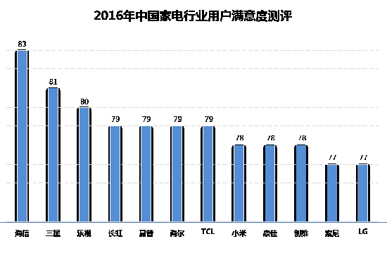 2017年1月3日,由中國質(zhì)量協(xié)會(huì)、全國用戶委員會(huì)組織開展的2016年中國家電行業(yè)用戶滿意度測(cè)評(píng)結(jié)果正式出爐:在電視類產(chǎn)品的用戶滿意度測(cè)評(píng)中,海信以83分高居第一,其次是三星、樂視TV、長虹、夏普。