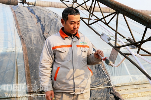王莊鎮(zhèn)農(nóng)民陳學文在查看自動化大棚卷簾機