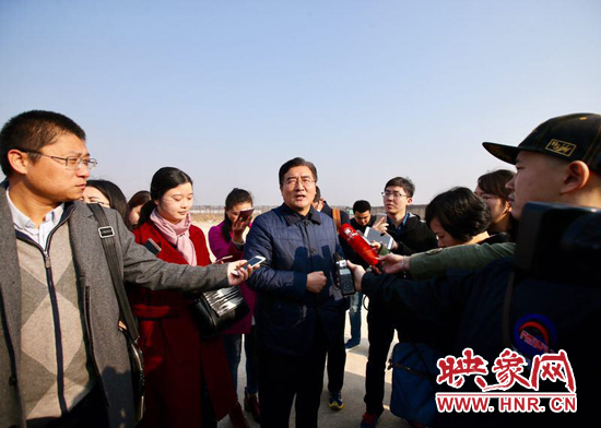 鄭州市上街區(qū)區(qū)委副書(shū)記李新軍(中)向記者介紹鄭州通航試驗(yàn)區(qū)情況。映象網(wǎng)記者 段晉哲/攝