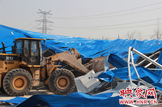 “轟”的一聲,位于滎陽(yáng)市京城辦康砦村龍港路段南側(cè)附近一個(gè)私自搭建的彩鋼瓦棚被鏟車鏟倒,標(biāo)志著京城路街道拆除違法占地、違法建筑活動(dòng)的正式開(kāi)始。