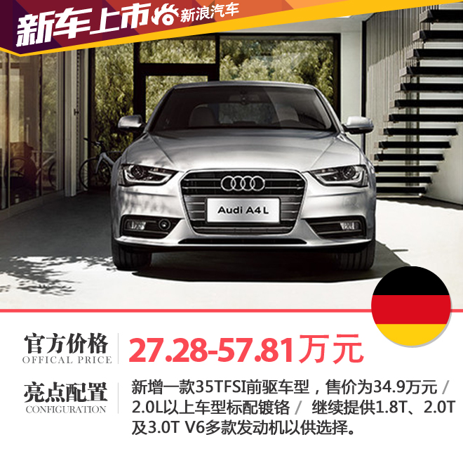 新浪汽車訊 日前,一汽-大眾奧迪官方宣布,旗下2016款A4L正式上市,新車售價區(qū)間為27.28-57.81萬元。2016款A4L在原A4L產品序列基礎上新增一款35TFSI前驅運動型車型,售價為34.9萬元。