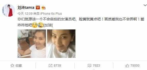 近期,劉濤在微博上面曬出了兩張照片,附文“你們就原諒一個(gè)不會(huì)自拍的女演員吧、臉黃就黃點(diǎn)吧!畫質(zhì)差我也不會(huì)弄??!愛(ài)咋咋地吧”!